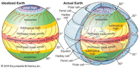 The globe on the right includes air circulation at higher altitudes. It shows the location of the Hadley cell, the Ferrel cell and the Polar cell. Surface winds are also shown which is important to understanding our weather.